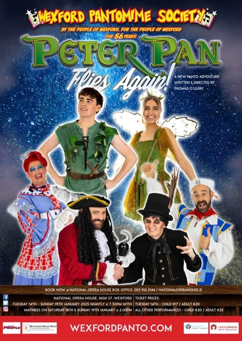 In January 2025, Wexford Pantomime Society brought audiences back to Neverland for the first time since 2012. Building on from Thomas O’Leary’s classic Panto, the script imagined what happened many years after Wendy, John and Michael had left their nursery adventure behind. Peter Pan and the Lost Boys were still locked in battle with the villainous Captain Hook and his band of pirates, but this time the story was told with some new twists, fresh characters, and plenty of Wexford humour.